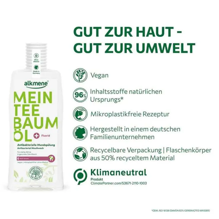 Gesamtfluoridgehalt 475 ppm. Nur wirksam in Verbindung mit Zähneputzen. Anteil an natürlichem Teebaumöl kann zur Trübung führen – ohne Einfluss auf die Qualität.