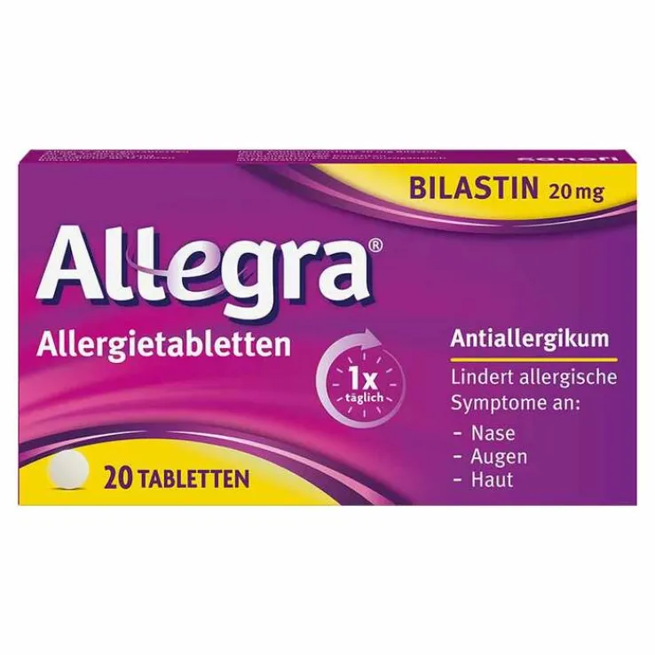 Allegra® Allergietabletten 20 mg Tabletten. Wirkstoff: Bilastin. Anwendungsgebiet: Antihistaminikum. Zur Linderung der Beschwerden allergischer Rhinokonjunktivitis und Urtikaria. Apothekenpflichtig. Zu Risiken und Nebenwirkungen lesen Sie die Packungsbeilage und fragen Sie Ihre Ärztin, Ihren Arzt oder in Ihrer Apotheke. A. Nattermann & Cie. GmbH, Brüningstraße 50, 65929 Frankfurt am Main. Stand: Dezember 2022 MAT-DE-2501021