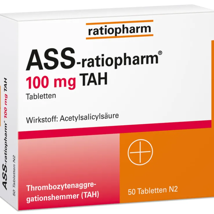 ASS-ratiopharm® 100 mg TAH TablettenWirkstoff: Acetylsalicylsäure 100 mg. Anwendungsgebiete: Instabile Angina pectoris (Herzschmerzen aufgrund von Durchblutungsstörungen in den Herzkranzgefäßen) – als Teil der Standardtherapie, akuter Herzinfarkt – als Teil der Standardtherapie, Vorbeugung eines weiteren Herzinfarktes nach erstem Herzinfarkt (zur Reinfarktprophylaxe), nach Operationen oder anderen Eingriffen an arteriellen Blutgefäßen (nach arteriellen gefäßchirurgischen oder interventionellen Eingriffen z. B. nach aortokoronarem Venen-Bypass [ACVB], bei perkutaner transluminaler koronarer Angioplastie [PTCA]), Vorbeugung von vorübergehender Mangeldurchblutung im Gehirn (TIA: transitorischen ischämischen Attacken) und Hirninfarkten, nachdem Vorläuferstadien (z. B. vorübergehende Lähmungserscheinungen im Gesicht oder der Armmuskulatur oder vorübergehender Sehverlust) aufgetreten sind. Hinweis: Nicht geeignet zur Behandlung von Schmerzzuständen. Apothekenpflichtig. Zu Risiken und Nebenwirkungen lesen Sie die Packungsbeilage und fragen Sie Ihre Ärztin, Ihren Arzt oder in Ihrer Apotheke. 1/25.