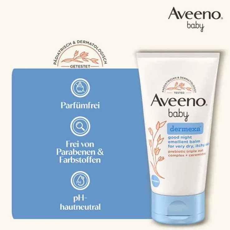 Aveeno baby Dermexa gute Nacht Emollientien Balsam mit dem 3-fachem Haferkomplex & Ceramide beruhigt sehr trockene, juckende Babyhaut & spendet intensive Feuchtigkeit – klinisch erwiesen. Es ist für Neugeborene und Kinder mit sehr trockener, juckender und zu Neurodermitis neigender Haut geeignet.