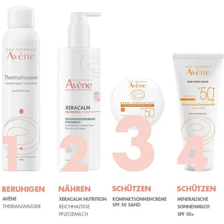 Die Avene mineralischen Sonnenschutzprodukte bieten einen hochverträglichen Sonnenschutz für die ganze Familie. Die zu 100% enthaltenen mineralischen Filter sorgen für einen sicheren UV-Breitbandschutz, das Antioxidans Pro-Tocopherol schützt die Haut vor Zellschäden und das Avene Thermalwasser wirkt hautberuhigend, reizlindernd und entzündungshemmend.