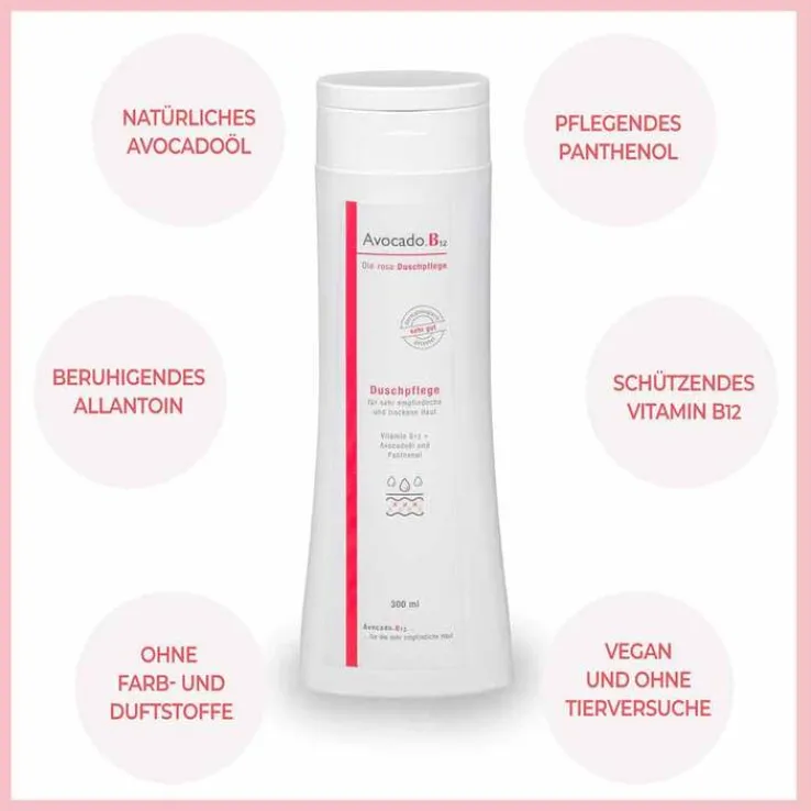 - Vitamin B12 gilt als antioxidativ wirkendes Vitamin, das sich bei Juckreiz und Rötungen bewährt hat. Zusätzlich schenkt es der Avocado.B12 Duschpflege die charakteristische rosa Farbe.