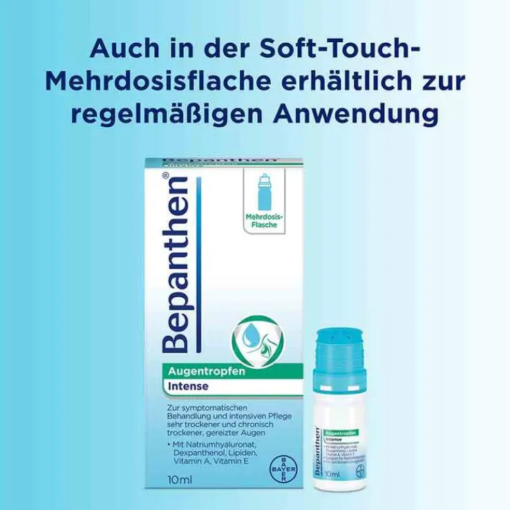Die neuen Bepanthen® Augentropfen Intense bieten eine wirksame Hilfe bei sehr trockenen Augen oder chronisch trockenen Augen. Durch die enthaltenen Inhaltsstoffe und den besonderen Lipid-Schutzschild-Komplex schützen Bepanthen® Augentropfen Intense vor der vorzeitigen Verdunstung des Tränenfilms und sorgen für eine langanhaltende Befeuchtung. Damit beruhigen Bepanthen® Augentropfen Intense sehr trockene Augen sowie chronisch trockene Augen und lindern die Beschwerden.