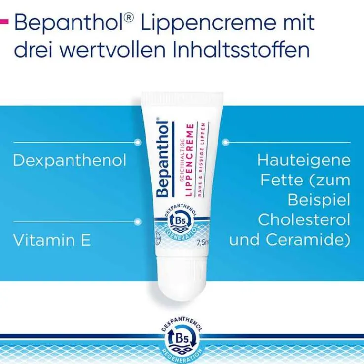Damit sich die Lippen wieder zart und weich anfühlen, setzt die Bepanthol reichhaltige Lippencreme auf die Wirkung von zwei Inhaltsstoffen: