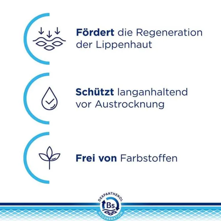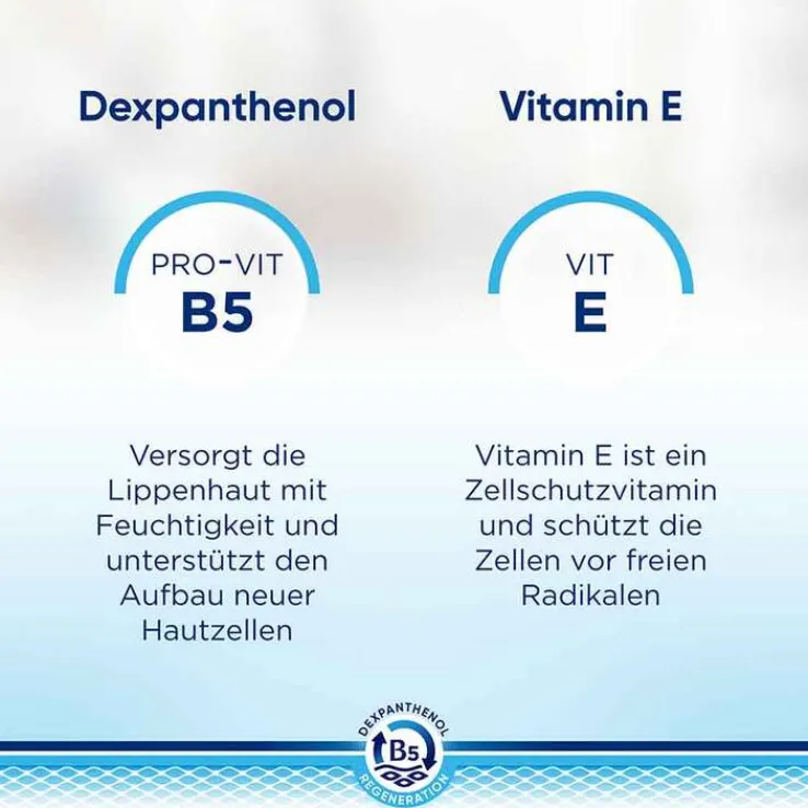- Dexpanthenol stellt den Lippen Feuchtigkeit zur Verfügung und unterstützt die Haut gleichzeitig bei der Produktion neuer Zellen.