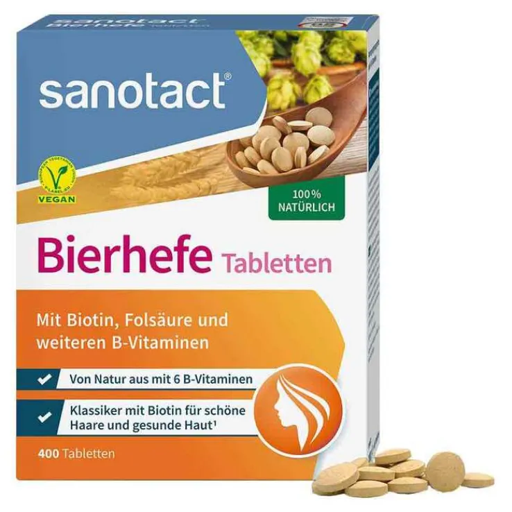 sanotact® Bierhefe Tabletten – Ein würziges Naturprodukt mit Biotin, B-Vitaminen und Folsäure zur Erhaltung von schönen Haaren und gesunder Haut.*