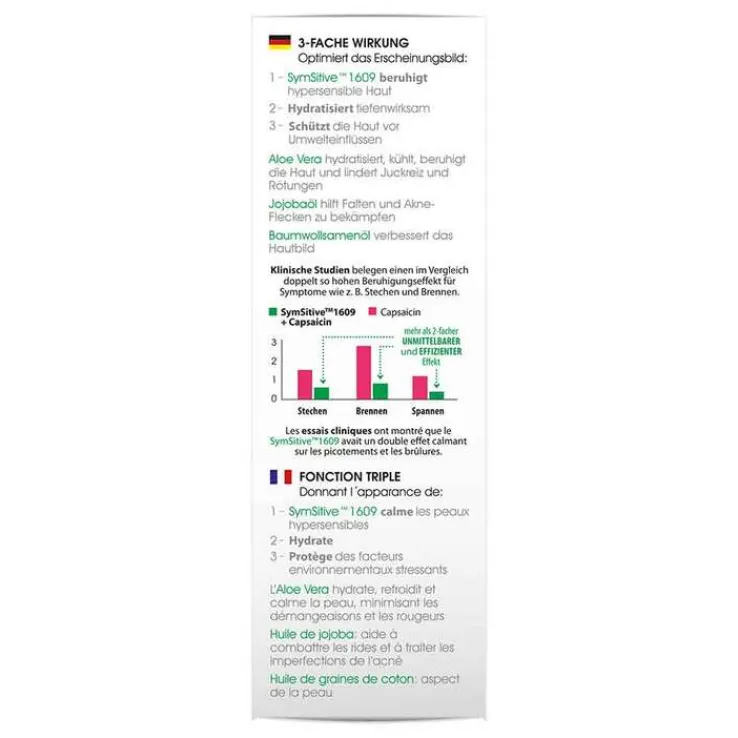 - SymSitive® 1609: vermindert Überreaktionen der Haut und wirkt dadurch hautberuhigend. Reduziert signifikant Hautempfindungen wie beispielsweise Brennen, Stechen und Hautspannungen.