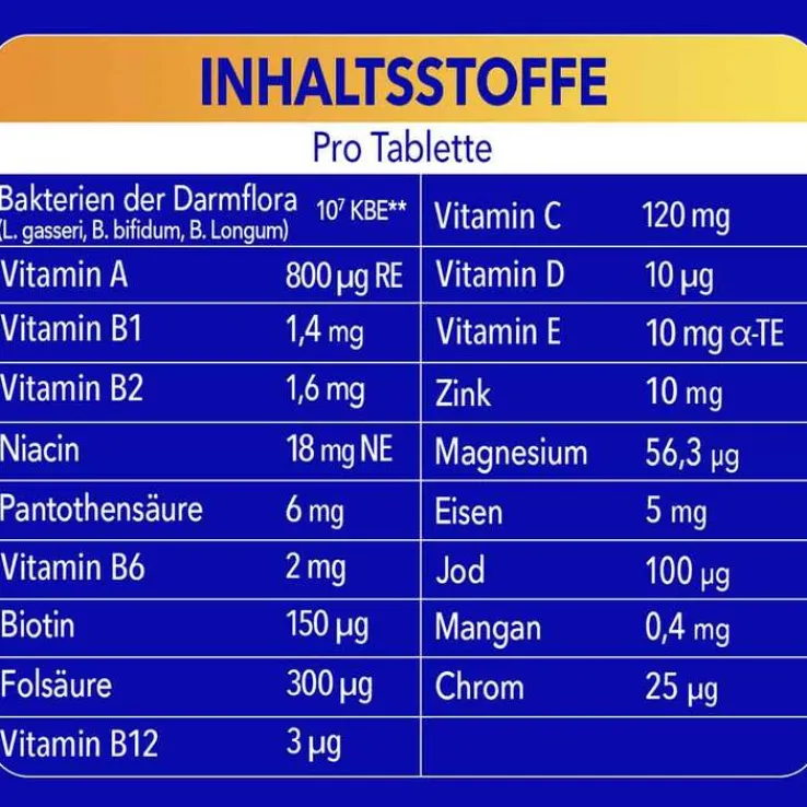 Trennmittel: Calciumphosphate; Füllstoff: Cellulose; Ascorbinsäure; Magnesiumoxid; Inulin; DL-alpha-Tocopherylacetat; Überzugsmittel: Hydroxypropylmethylcellulose; Maltodextrin; Dextrose; Trennmittel: Mono- und Diglyceride von Speisefettsäuren; Nicotinamid; Füllstoff: Polyvinylpyrrolidon; Überzugsmittel: Hydroxypropylcellulose; Stärke; Eisensulfat; modifizierte Stärke; Zinkoxid; Füllstoff: Polyvinylpolypyrrolidon; Trennmittel: Magnesiumsalze der Speisefettsäuren; Calcium-D-pantothenat; Füllstoff: vernetzte Natriumcarboxymethylcellulose; Pyridoxinhydrochlorid; Thiaminmononitrat; Riboflavin; Farbstoff: Eisenoxide und Eisenhydroxide; Trennmittel: Siliciumdioxid; Bakterienkulturen (Lactobacillus gasseri PA 16/8, Bifidobacterium bifidum MF 20/5, Bifidobacterium longum SP 07/3)*; Mangansulfat; Retinylacetat; Zucker; Folsäure; D-Biotin; Kaliumiodid; mittelkettige Triglyceride (aus Palmöl); Chrom-(III)-chlorid; Natriumselenat; Cholecalciferol; Cyanocobalamin.