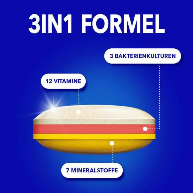 Die spezielle 3-in-1 Tablette kombiniert 12 Vitamine und 7 Mineralstoffe mit einer Schicht aus 3 Bakterien der Darmflora, die den Darm lebend erreichen⁴.