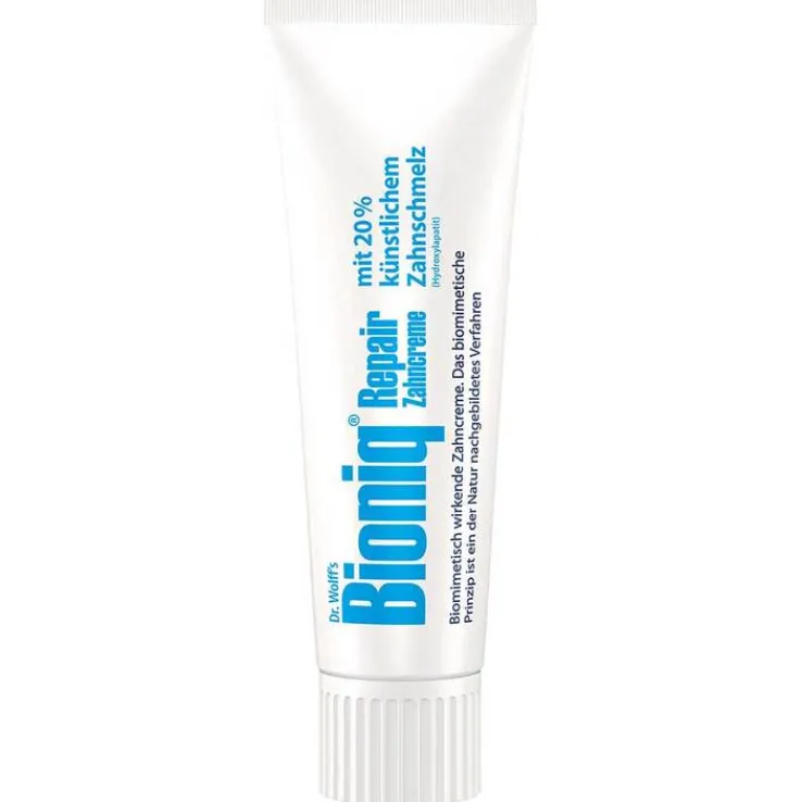 Die Bioniq Repair-Zahncreme basiert auf der Idee der Bionik/Biomimetik. Sie enthält Hydroxylapatit – eine Substanz, die dem menschlichen Zahnschmelz nachempfunden ist. Dieser Inhaltsstoff hilft, den Zahnschmelzabtrag zu minimieren und sowohl Zähne als auch Zahnfleisch langfristig gesund zu halten.