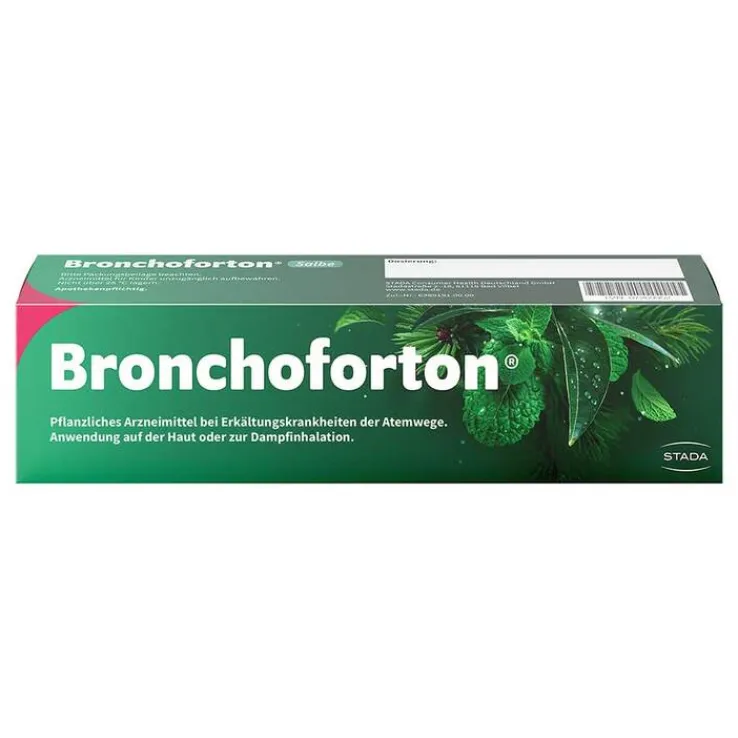 Bronchoforton® Salbe10%/10%/5% Zur Anwendung bei Kindern ab 4 Jahren und Erwachsenen Wirkstoffe: Eukalyptusöl, Fichtennadelöl, Pfefferminzöl. Zur Inhalation und äußerlichen Anwendung zur Besserung der Beschwerden bei Erkältungskrankheiten der Atemwege mit zähflüssigem Schleim. Hinweis: Enthält Stearylalkohol. Zu Risiken und Nebenwirkungen lesen Sie die Packungsbeilage und fragen Sie Ihre Ärztin, Ihren Arzt oder in Ihrer Apotheke. STADA Consumer Health Deutschland GmbH, Stadastraße 2-18, 61118 Bad Vilbel Stand: März 2022