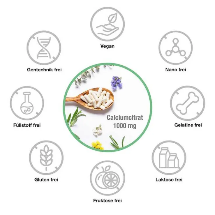 Calciumcitrat (86%), Überzugsmittel Gelatine Rind (Kapselhülle).