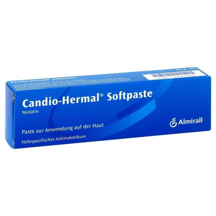 Candio-Hermal® Softpaste. Wirkstoff: Nystatin. Anwendungsgebiete: Nässende Hefepilzinfektionen der Haut bei Windeldermatitis (Windelsoor auf wunder Haut). Zu Risiken und Nebenwirkungen lesen Sie die Packungsbeilage und fragen Sie Ihre Ärztin, Ihren Arzt oder in Ihrer Apotheke. ALMIRALL HERMAL GmbH