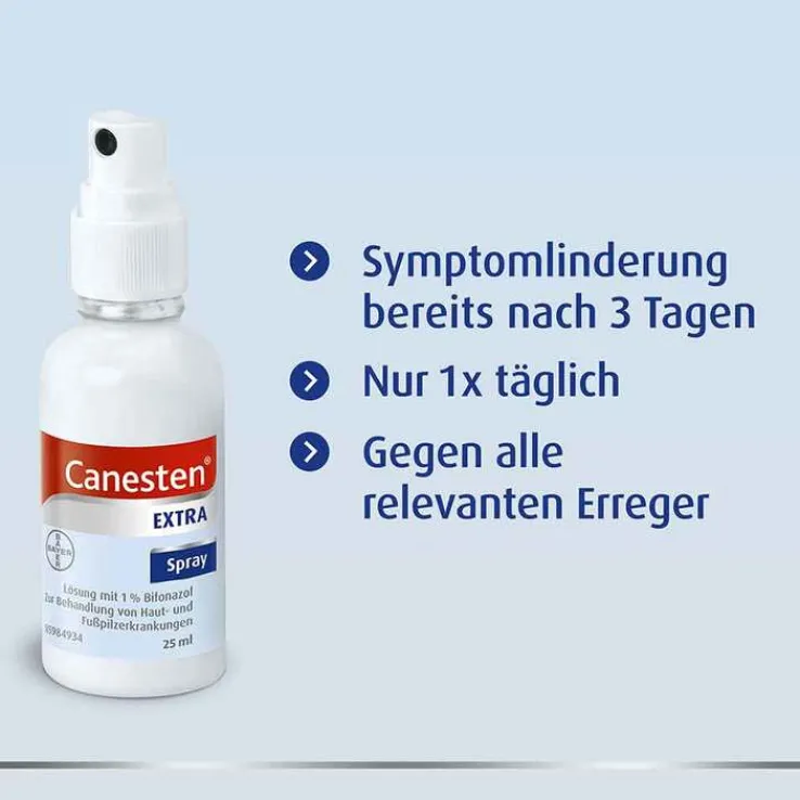Es muss eine schnelle und unkomplizierte Lösung her. Das Canesten® EXTRA Spray bietet genau das und wird nur einmal pro Tag angewendet. Der Wirkstoff Bifonazol bekämpft alle relevanten Pilzerreger und besitzt zudem einen entzündungshemmenden Zusatzeffekt. Die Folge: Beschwerden werden meist schon innerhalb von drei Tagen gelindert und Erreger erfolgreich bekämpft. Binnen weniger Wochen ist die Behandlung erfolgreich abgeschlossen.