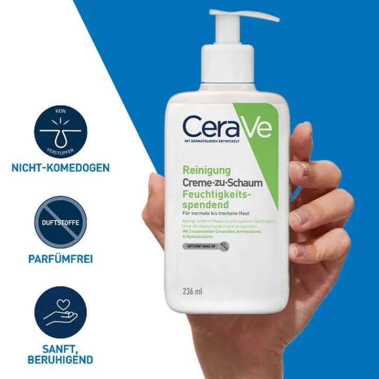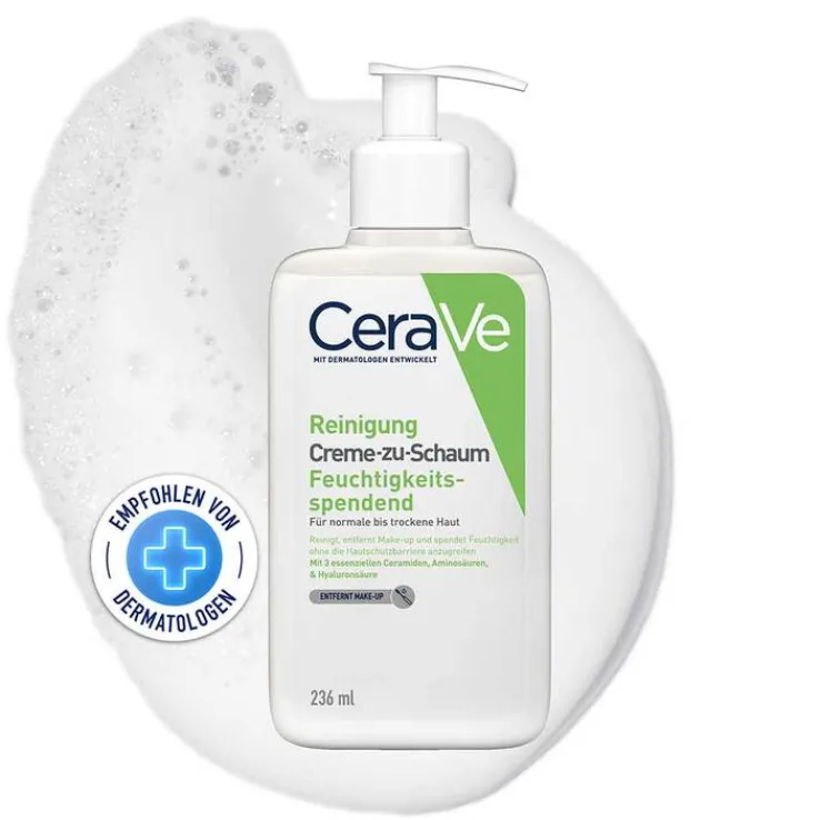 Die feuchtigkeitsspendende Creme-zu-Schaum Reinigung von Cerave ist eine Reinigungscreme für normale bis trockene Haut. Die Creme reinigt sanft, entfernt Make-up und spendet Feuchtigkeit, ohne die Hautschutzbarriere anzugreifen.