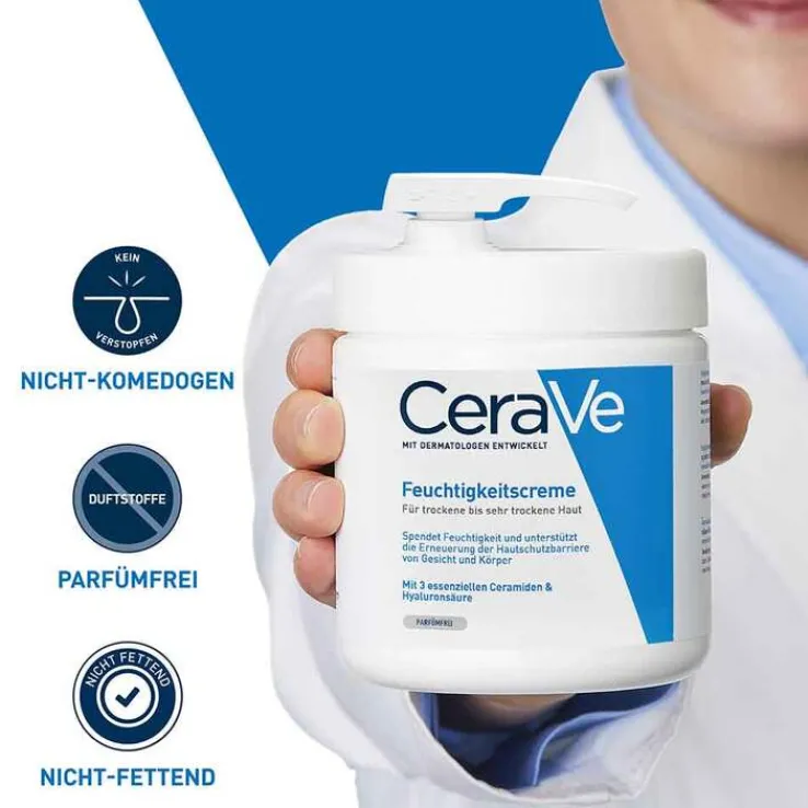Die CeraVe Feuchtigkeitscreme für trockene bis sehr trockene Haut großzügig und beliebig oft auf Gesicht und Körper auftragen und sanft einmassieren.
