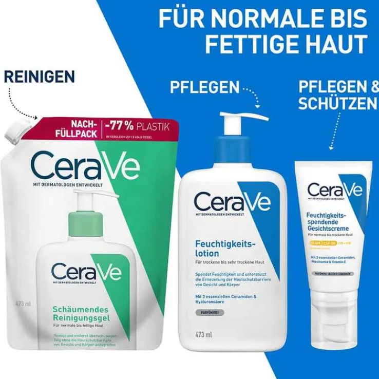 CeraVe schäumendes Reinigungsgel für normale bis fettige Haut Die pflegende Reinigung mit feuchtigkeitsspendendem Hyaluron, drei essenziellen Ceramiden, beruhigendem Niacinamid und Glycerin reinigt effektiv und unterstützt dabei die hauteigenen Schutzmechanismen der Haut. Das pflegende Reinigungsgel eignet sich für Gesicht und Körper .