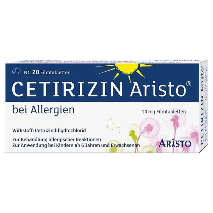 Cetirizin Aristo® bei Allergien, 10 mg Filmtabletten Wirkstoff: Cetirizindihydrochlorid. Kdr. ab 6 J. u. Erwachs.: Behandlung v. Krankheitszeichen (Symptomen) bei allerg. Erkrankungen wie chron. Nesselsucht (Urtikaria) (mit z. B. Juckreiz, Quaddelbildung, Haut-Rötung); chron. allerg. Schnupfen; Juckreiz bei Nesselsucht (Urtikaria) u. atopischer Dermatitis (Neurodermitis) mit Beschwerden wie Rötung der Haut; Heuschnupfen (mit z. B. Niesen, Nasenlaufen, Nasenjucken, Nasenverstopfung, Rötung bzw. Jucken der Augen u. Tränenfluss); z. Unterstützung b. asthmoiden Zuständen allerg. Herkunft. Enthält Lactose. Packungsbeilage beachten. Zu Risiken und Nebenwirkungen lesen Sie die Packungsbeilage und fragen Sie Ihre Ärztin, Ihren Arzt oder in Ihrer Apotheke. Apothekenpflichtig. (Stand November 2023). Aristo Pharma GmbH, Wallenroder Straße 8-10, 13435 Berlin.