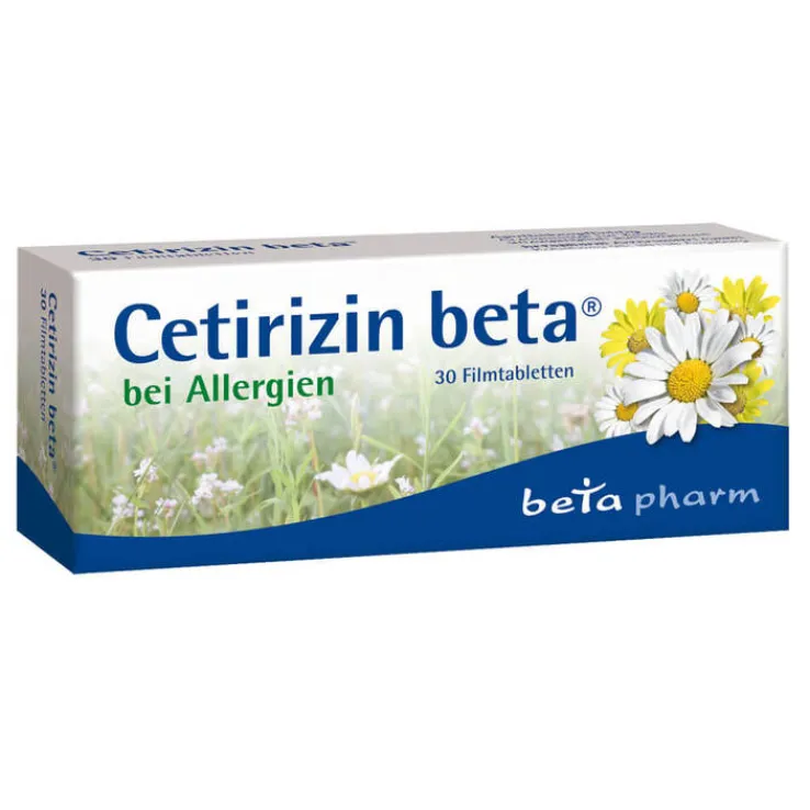 Cetirizin beta® Filmtabletten. Wirkstoff: Cetirizindihydrochlorid. Anw.: Zur Behandlung von Krankheitszeichen bei allerg. Erkrankungen, wie chron. Nesselsucht mit Beschwerden, z. B. Juckreiz, Quaddelbildung, Rötung d. Haut; chron. allerg. Schnupfen; Juckreiz bei chron. Nesselsucht u. bei atopischer Dermatitis (Neurodermitis) mit Beschwerden wie Rötung d. Haut; Heuschnupfen mit Beschwerden, wie z. B. Niesen, Nasenlaufen, Nasenjucken, Nasenverstopfung, Rötung bzw. Jucken d. Augen sowie Tränenfluss; asthmoide Zustände allerg. Herkunft – als unterstützende Maßnahme zur Unterdrückung entspr. Beschwerden. Warnhinw.: Enth. Lactose. Bitte nehmen Sie Cetirizin beta® daher erst nach Rücksprache mit Ihrem Arzt ein, wenn Ihnen bekannt ist, dass Sie unter einer Unverträglichkeit gegenüber bestimmten Zuckern leiden. Zu Risiken und Nebenwirkungen lesen Sie die Packungsbeilage und fragen Sie Ihre Ärztin, Ihren Arzt oder in Ihrer Apotheke. betapharm Arzneimittel GmbH, 86156 Augsburg.