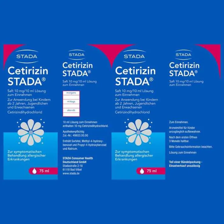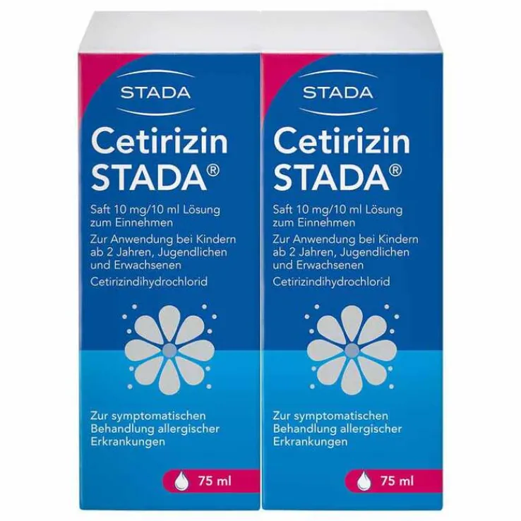 Cetirizin STADA® Saft 10 mg/10 ml Lösung zum Einnehmen. Zur Anwendung bei Kindern ab 2 Jahren, Jugendlichen und Erwachsenen. Wirkstoff: Cetirizindihydrochlorid. Zur Linderung von Nasen- und Augensymptomen bei saisonaler und ganzjähriger allergischer Rhinitis und chronischer Nesselsucht (chronische idiopathische Urtikaria). Enthält: Sorbitol, Methyl-4-hydroxybenzoat und Propyl-4-hydroxybenzoat. Zu Risiken und Nebenwirkungen lesen Sie bitte die Packungsbeilage und fragen Sie Ihren Arzt oder Apotheker. STADA Consumer Health Deutschland GmbH, Stadastraße 2-18, 61118 Bad Vilbel. Stand: Juli 2020