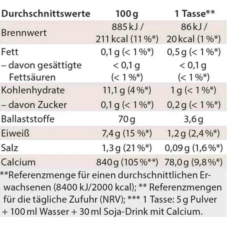 | * Tagesportion = 1 Tasse (=5 g) +100 ml Wasser + 30 ml Soja-Drink mit Calcium ** Referenzmengen für die tägliche Zufuhr (NRV); | ||