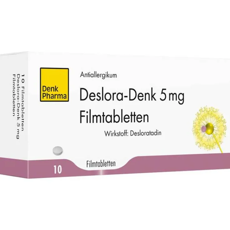 Deslora-Denk 5 mg Filmtabletten Wirkstoff: Desloratadin. Anwendungsgeb.: Zur Besserung der Symptomatik bei allergischer Rhinitis und Urtikaria bei Erwachsenen und Jugendlichen ab 12 Jahren. Warnhinw.: Enthält Lactose. Zu Risiken und Nebenwirkungen lesen Sie die Packungsbeilage und fragen Sie Ihre Ärztin, Ihren Arzt oder in Ihrer Apotheke. ! Apothekenpflichtig. Stand: 03/2020. Denk Pharma GmbH & Co. KG, 81675 München