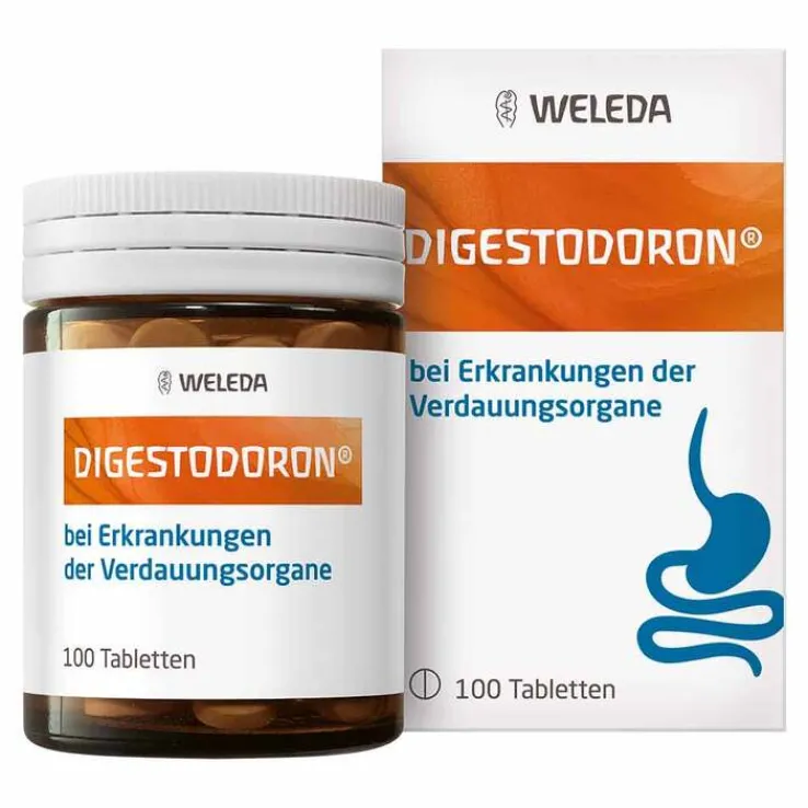 Digestodoron® Tabletten Warnhinweis: Enthält Lactose und Weizenstärke, bitte Packungsbeilage beachten. Gemäß der anthroposophischen Menschen- und Naturerkenntnis. Dazu gehören: Störungen der Absonderungs- und Bewegungstätigkeit sowie des Milieus im Verdauungstrakt, auch auf chronisch-entzündlicher Grundlage, z.B. Sodbrennen, Übelkeit, Blähungen, Durchfälle, Verstopfung, entzündliche Erkrankungen von Dünn- und Dickdarm (Enteritis granulomatosa, Colitis ulcerosa). Dosierung und Art der Anwendung Soweit nicht anders verordnet, nehmen Erwachsene und Jugendliche 2 – 4 Tabletten, Schulkinder von 6 bis 11 Jahren 1 – 2 Tabletten, Kleinkinder von 2 bis 5 Jahren 1 Tablette, Säuglinge und Kleinkinder unter 2 Jahren 1/2 Tablette, jeweils 1 – 3 mal täglich ca. 1/4 Stunde vor den Mahlzeiten mit etwas Wasser ein. Kinder bis zu 5 Jahren erhalten die Tabletten in zerstoßener Form oder in Wasser oder Tee aufgelöst. Zu Risiken und Nebenwirkungen lesen Sie die Packungsbeilage und fragen Sie Ihre Ärztin, Ihren Arzt oder in Ihrer Apotheke. Weleda AG, Schwäbisch Gmünd