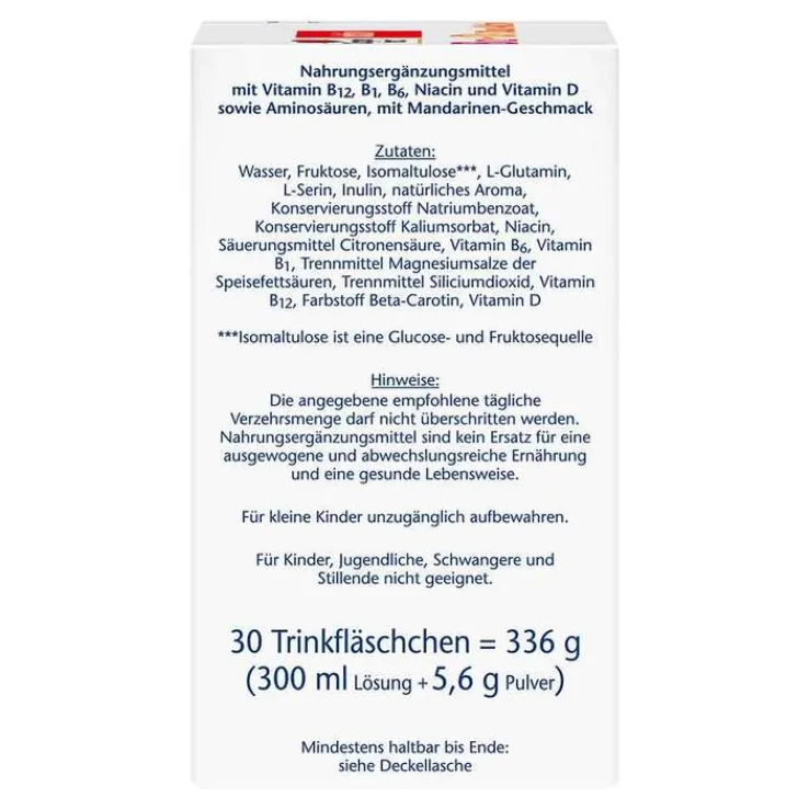 Nahrungsergänzungsmittel mit Vitamin B12, B1, B6, Niacin und Vitamin D sowie Aminosäuren mit Mandarinen-Geschmack