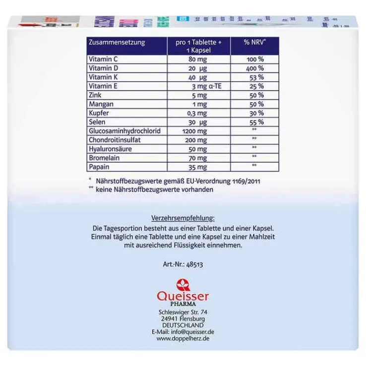 - Nahrungsergänzungsmittel mit Vitaminen, Spurenelementen, Glucosaminhydrochlorid, Chondroitinsulfat, Hyaluronsäure, Bromelain und Papain