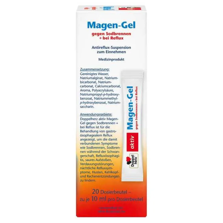 Doppelherz aktiv Magen-Gel gegen Sodbrennen + bei Reflux ist für die Behandlung von gastroösophagealem Reflux angezeigt, um die damit verbundenen Symptome wie Sodbrennen, Sodbrennen während der Schwangerschaft, Refluxösophagitis, saures Aufstoßen, Verdauungsstörungen, nächtliche Refluxsymptome, Husten, Kehlkopf- und Rachenentzündungen zu lindern.