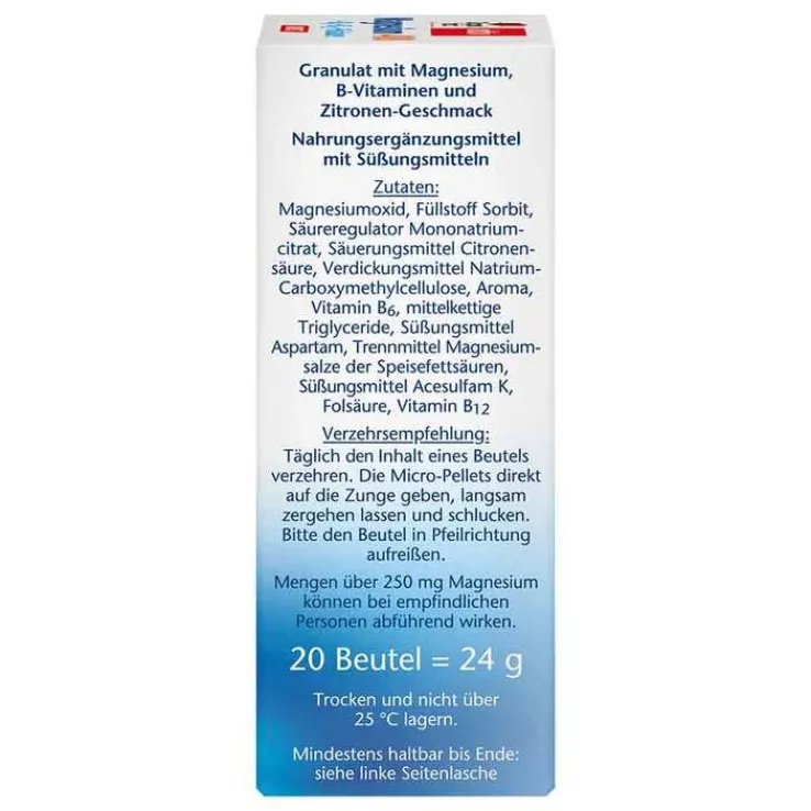 Die Micro-Pellets von Doppelherz enthalten Magnesium in sinnvoller Kombination mit den Vitaminen B6, B12 und Folsäure. Die Vitamine B6 und B12 leisten einen Beitrag zur normalen Funktion des Immunsystems und zur normalen Bildung der roten Blutkörperchen. Darüber hinaus trägt Vitamin B6 zum normalen Eiweißstoffwechsel bei. Folsäure unterstützt die normale Blutbildung und hat eine Funktion bei der Zellteilung. Zusammen erfüllen diese drei B-Vitamine Aufgaben im normalen Homocysteinstoffwechsel.*