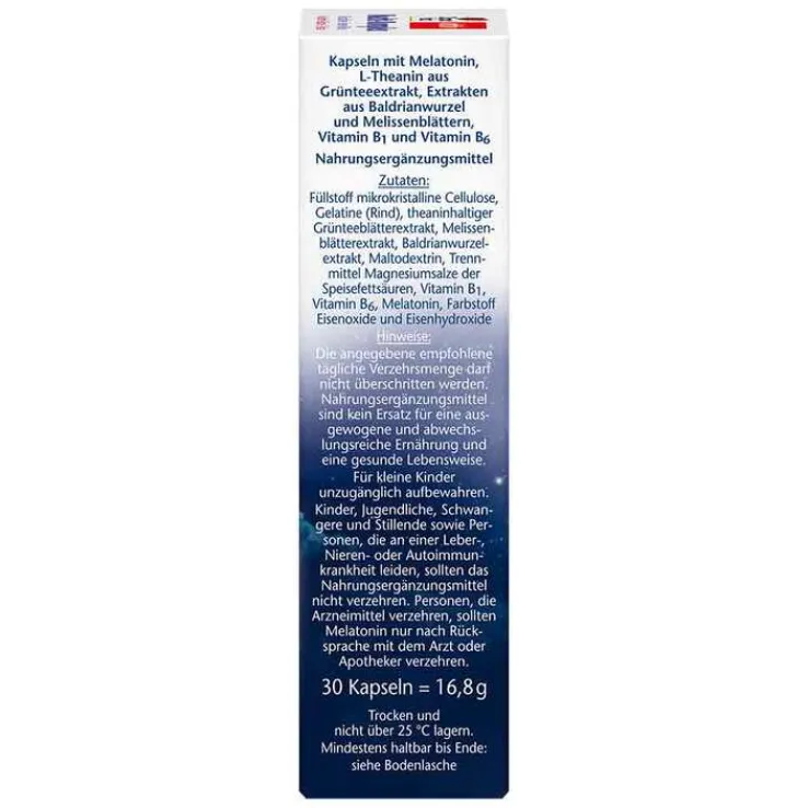 - Nahrungsergänzungsmittel mit Melatonin, L-Theanin aus Grünteeextrakt, Extrakten aus Baldrianwurzel und Melissenblättern, Vitamin B1 und Vitamin B6