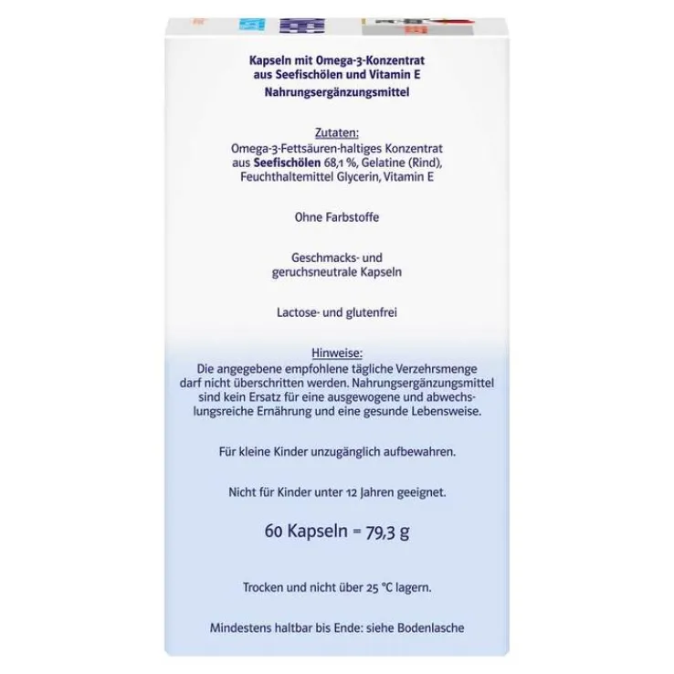 - Nahrungsergänzung mit 500 mg Omega-3-Fettsäuren (EPA + DHA) pro Kapsel