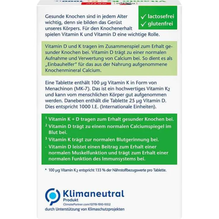 Eine Tablette enthält 100 μg Vitamin K in Form von Menachinon (MK-7). Das ist ein hochwertiges Vitamin K2 und kann vom menschlichen Körper gut aufgenommen werden. Vitamin K trägt zudem zur normalen Blutgerinnung bei. Daneben enthält die Tablette 25 μg Vitamin D. Dies entspricht 1000 I.E. (Internationale Einheiten). Vitamin D leistet zudem einen Beitrag zum Erhalt einer normalen Muskelfunktion und trägt zum Erhalt einer normalen Funktion des Immunsystems bei.
