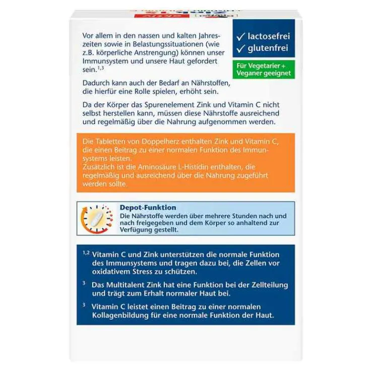 Die Tabletten von Doppelherz Zink + Histidin + Vitamin C Depot enthalten Zink und Vitamin C, die einen Beitrag zu einer normalen Funktion des Immunsystems* leisten. Zusätzlich ist die Aminosäure L-Histidin enthalten, die regelmäßig und ausreichend über die Nahrung zugeführt werden sollte.