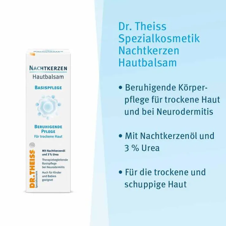 Dr. Theiss Nachtkerzen Hautbalsam ist eine angenehm leichte Öl-in-Wasser-Emulsion, angereichert mit pflegendem Urea, Squalan, Jojobaöl und Guaiazulen. Er wurde speziell entwickelt, um die empfindliche, trockene Haut täglich mit Fett und Feuchtigkeit zu versorgen. Dabei ist er so sanft, dass er auch für die Pflege der empfindlichen Baby- und Kinderhaut bestens geeignet ist.