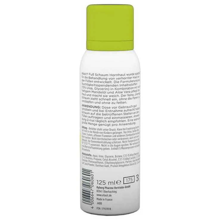 Efasit Fuß Schaum Hornhaut ist speziell auf die Bedürfnisse von verhornter Haut an den Füßen abgestimmt. Die Rezeptur bestehend aus hydratisierendem Glycerin und einem hohen Anteil an Urea verwöhnt die Haut intensiv mit Feuchtigkeit. Das enthaltene Mandelöl pflegt und regeneriert die Haut. Es entsteht ein Gefühl weicher und geschmeidiger Haut. Der Fuß Schaum von Efasit spendet wohltuende Feuchtigkeit und zieht dank seiner Textur schnell ein, ohne zu fetten.