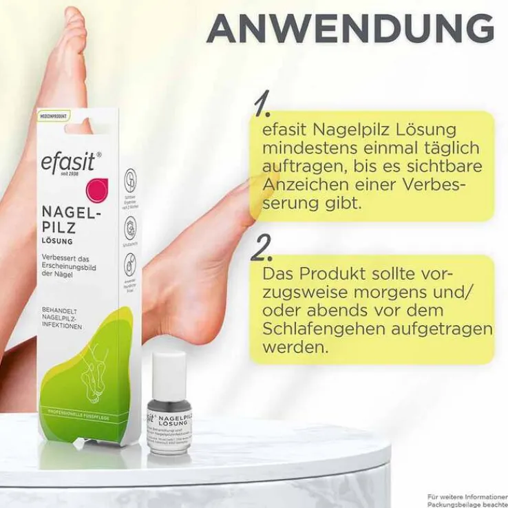 Für ein optimales Ergebnis wird die Anwendung von efasit Nagelpilz Lösung so lange fortgesetzt, bis der geschädigte Teil des Nagels vollständig verschwunden und ein gesunder Nagel nachgewachsen ist.