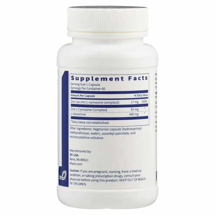 L-Glutamin, Kapselhülle (Füllstoff Hydroxypropylmethylcellulose, Wasser), Zink-L-Carnosin, Antioxidationsmittel Fettsäureester der Ascorbinsäure, Füllstoff mikrokristalline Cellulose.