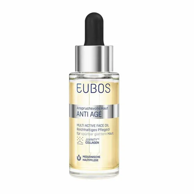 Das Eubos Anti-Age Multi Active Face Oil ist eine Pflege mit natürlichen Ölen und innovativen Inhaltsstoffen. Juvinity™*belebt die Zellfunktion, fördert den Aufbau von hauteigenem Hyaluron und Kollagen. Gatuline** In-Tense restrukturiert, stärkt das hauteigene Kollagennetzwerk. Defensil (ein pflanzlicher Wirkstoffkomplex mit Extrakt aus Herzsamen) lindert Reizungen von empfindlicher, geröteter Haut. Eubos Anti-Age Multi Active Face Oil ist auch zur Beigabe weniger Tropfen in die Anti Age Tages- und Nachtpflege geeignet. Das Ergebnis ist ein verfeinertes, zarteres Hautbild und eine deutlich verbesserte Hautfeuchtigkeit.