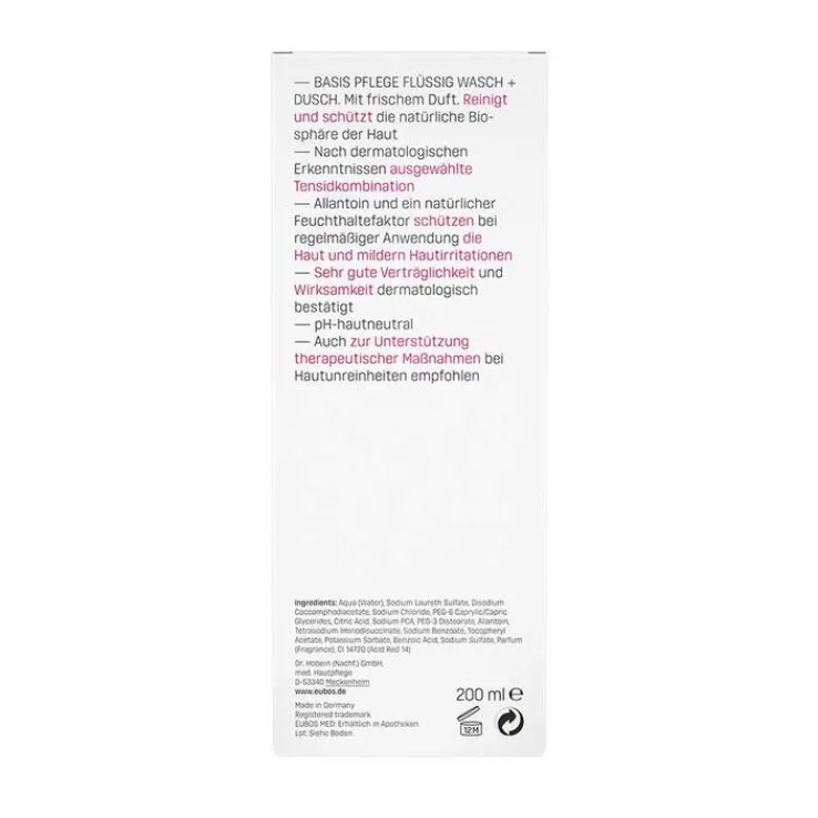 Eubos flüssig rot mit frischem Duft enthält eine nach dermatologischen Erkenntnissen ausgewählte Tensidkombination. Allantoin und ein natürlicher Feuchthaltefaktor schützen bei regelmäßiger Anwendung die Haut und mildern Hautirritationen. Die sehr gute Verträglichkeit und Wirksamkeit ist dermatologisch bestätigt. Die Waschlotion wird auch zur Unterstützung therapeutischer Maßnahmen bei Hautunreinheiten empfohlen und ist pH-hautneutral. Die Verträglichkeit wurde dermatologisch getestet.