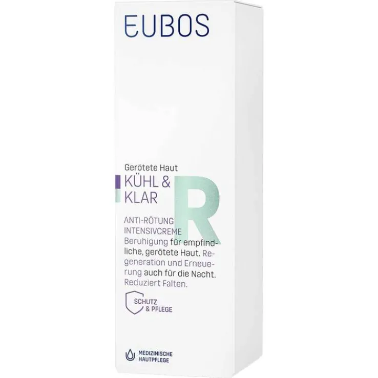 Die Eubos Kühl & Klar Anti-Rötung Intensivcreme ist ein medizinisches Pflegeprodukt für trockene Haut bei Rosacea. Die Creme ist ideal zur Regeneration und Erneuerung für die Nacht. Der Aktivstoff Hydra Synol DOI füllt die Feuchtigkeitsdepots nachweislich auf. Das enthaltene antibakterielle Mikrosilber stärkt und stabilisiert die Mikroflora. Der Phyto-Aktivstoffkomplex mit italienischer Immortelle hemmt Entzündungsvorgänge und stärkt die Gefäße. Rötungen und Schwellungen werden sichtbar reduziert. Die Creme eignet sich Therapie begleitend bei Couperose und Rosacea und wurde dermatologisch getestet.