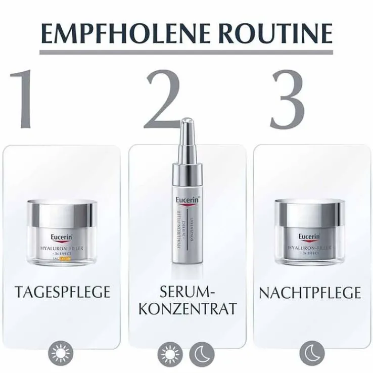 Eucerin Hyaluron-Filler Serum-Konzentrat: Aqua, Glycerin, Cetearyl Alcohol, Alcohol Denat., Coco-Caprylate, Caprylic/Capric Triglyceride, Dicaprylyl Carbonate, Propylheptyl Caprylate, Sodium Hyaluronate, Glycine Soja Germ Extract, Glycyrrhetinic Acid, Tocopherol, Sodium Stearoyl Glutamate, Sodium Chloride, Carbomer, Sodium Hydroxide, Ethylhexylglycerin, Phenoxyethanol, Pentaerythrityl Tetra-di-t-butyl Hydroxyhydrocinnamate, Parfum