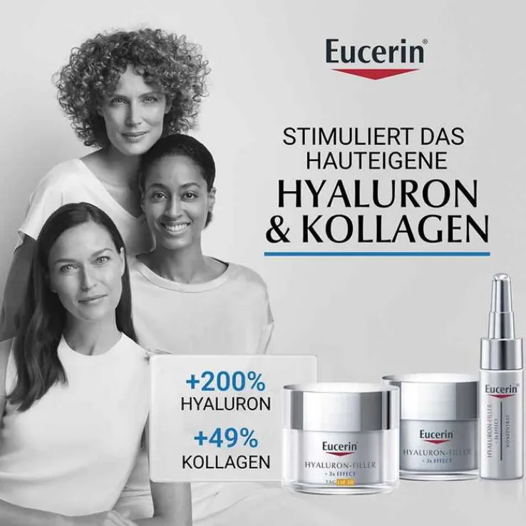 Die Eucerin Hyaluron-Filler Tagespflege LSF 30 (20ml) ist für alle Hauttypen geeignet und wirkt ab den ersten Anzeichen der Hautalterung. Sie stimuliert die hauteigene Hyaluronsäureproduktion und schützt vor Hyaluronsäure-Abbau, sodass sowohl erste Fältchen als auch tiefe Falten von innen heraus aufgepolstert werden.