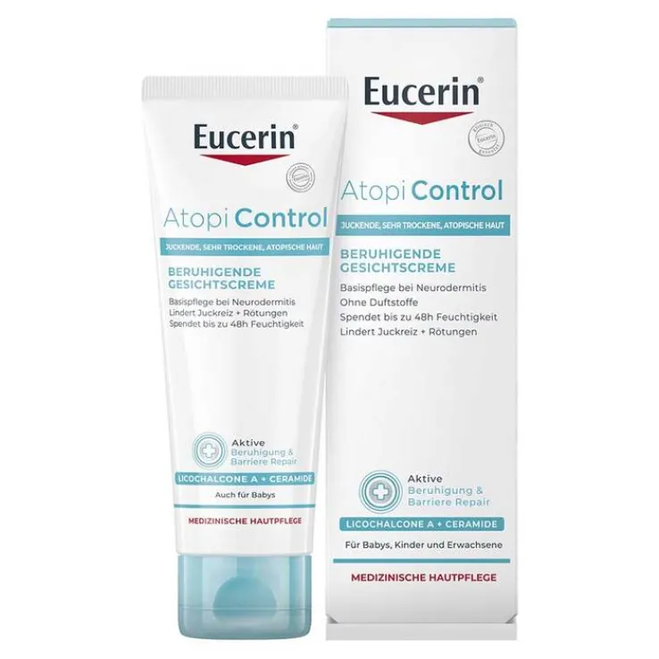 Mit der Eucerin AtopiControl Gesichtscreme wird trockene, rissige Haut und neurodermitische Gesichtshaut während symptomfreien Phasen täglich gepflegt. In akuten Phasen der Neurodermitis sollte Eucerin AtopiControl Akut Creme verwendet werden. Die Creme sorgt für ein spürbar weicheres und geschmeidigeres Hautgefühl. Die enthaltenen Wirkstoffe wie Omega-6-Fettsäuren und Licochalcone A wirken beruhigend und glätten die Gesichtshaut. Zudem werden Juckreiz, Spannungen und Rötungen entgegengewirkt.