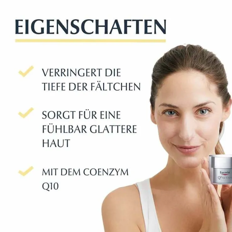 Die Eucerin Q10 Active Nachtpflege mit hauteigenem Coenzym Q10 füllt die Energiespeicher der Hautzellen auf, regt den Hautstoffwechsel an und mildert so Fältchen und Falten. Als ideale Nachtcreme für reife und empfindliche Haut wirkt sie Zeichen der Hautalterung entgegen und unterstützt die Zellregeneration in der Nacht*. Mit seiner antioxidativen Wirkung bewahrt das enthaltene Q10 zudem vor oxidativem Stress durch freie Radikale, belebt und stärkt die Haut. So fühlt sich die Gesichtshaut bei regelmäßiger Anwendung spürbar straffer und geschmeidiger an.