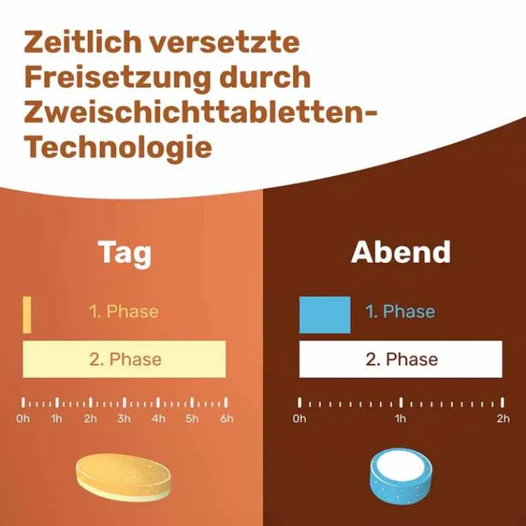 Beide Tabletten bestehen aus 2 Schichten, wobei bei der Abendtablette eine innovative Tablet-in-Tablet-Technologie angewendet wurde. Dadurch werden nicht alle enthaltenen Nährstoffe gleichzeitig freigesetzt, sondern die wasserlöslichen Vitamine in der ersten Schicht in den ersten 5-10 Minuten und die Nährstoffe in der zweiten Schicht dahingehend vorteilhaft koordiniert innerhalb weniger Stunden.