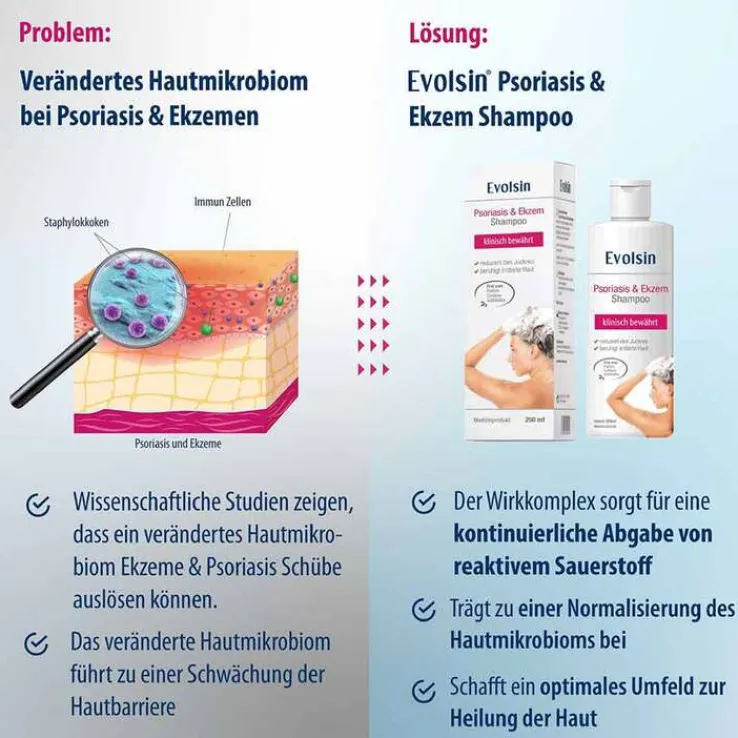 Evolsin® Ekzem & Psoriasis Shampoo reduziert Juckreiz und beruhigt gereizte Kopfhaut bei verschiedenen Hauterkrankungen wie Psoriasis/ Schuppenflechte, Ekzemen und Neurodermitis.