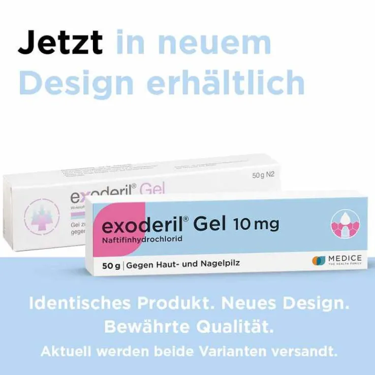 exoderil® Gel 10 mg ; Anwendungsgebiete: Pilzinfektionen der Haut (Dermatomykosen), verursacht durch Dermatophyten, Hefe und Schimmelpilze sowie Mischinfektionen mit Bakterien. Bei Pilzinfektionen der Nägel (Onychomykosen) ist ein Behandlungsversuch angezeigt. Warnhinweise: Enthält Propylenglycol. Nicht ins Auge bringen. Nicht auf Schleimhäuten und offenen Wunden anwenden. Zu Risiken und Nebenwirkungen lesen Sie die Packungsbeilage und fragen Sie Ihre Ärztin, Ihren Arzt oder in Ihrer Apotheke; 02/2018