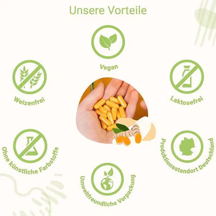 Mit Curcugreen™ verwenden wir eines der hochwertigsten Kurkuma-Extrakte in unseren Kurkuma Kapseln, welche es auf dem Markt gibt. Curcugreen™ ist ein patentierter Rohstoff und macht unsere Kurkuma-Kapseln 7-fach wirksamer.